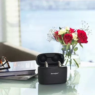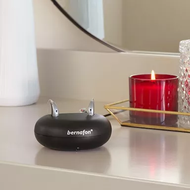 Bernafon’s most popular hearing aid style provides power for a full day of use including sound streaming. It is discreet and sits comfortably behind your ear. The lithium-ion batteries charge quickly with one of two chargers.